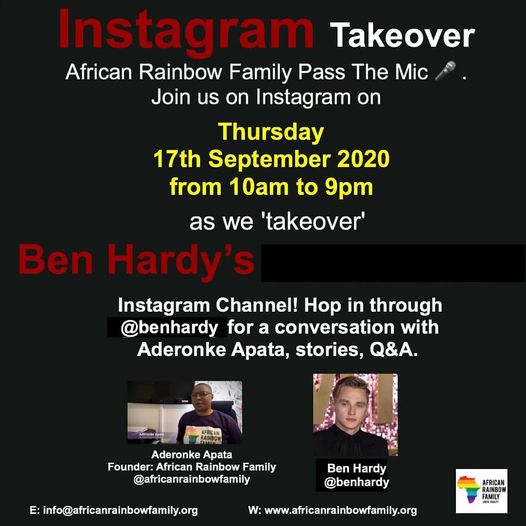 On 17 September 2020 from 10.00am to 9.00pm, African Rainbow Family will ‘takeover’ Ben Hardy’s Instagram channel! Join them on Instagram using @benhardy and follow @africanrainbowfamily