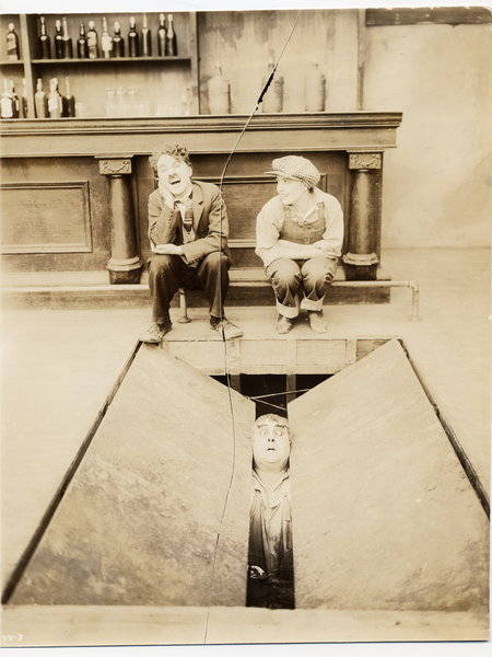 In the film Behind The Screen, an aspiring actress (Edna Purviance), desperate for work, disguises herself as a man and is hired at the studio as a stagehand when the regular crew strikes.