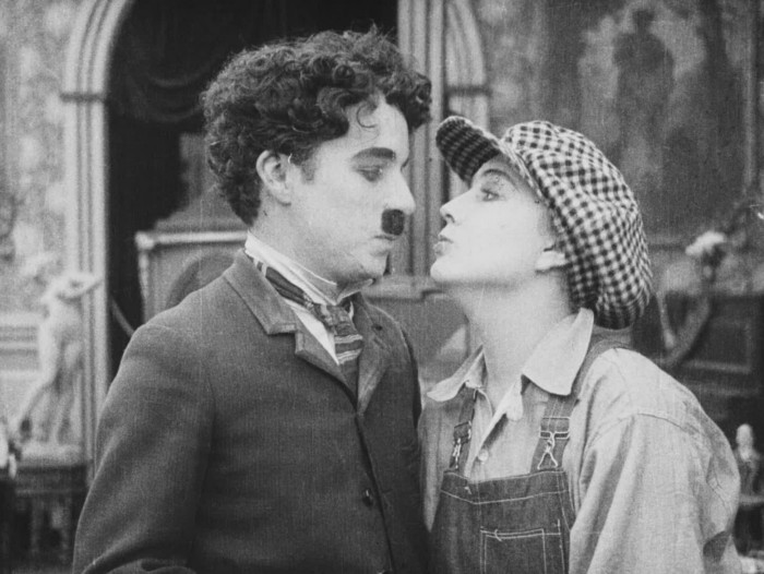 Charlie, discovering that the new stagehand is in fact a woman, gently kisses her just as Goliath (Eric Campbell) enters. “Oh you naughty boys!” Goliath remarks, as he teasingly pinches their cheeks and dances about in an effeminate manner before offering his backside to Charlie, which Charlie promptly kicks. This curious scene representing a homosexual situation is highly unusual in American commercial cinema for its time.