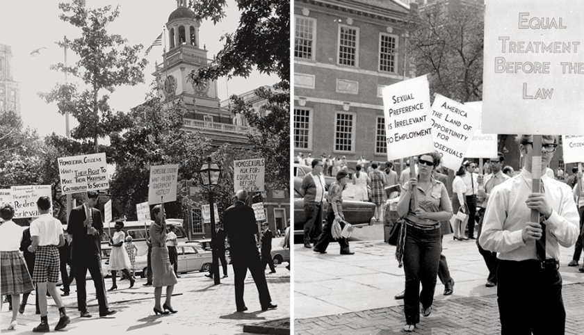 These were held annually at Independence Hall on 4 July from 1965 to 1969. Protesters gathered in front of Independence Hall to demand the public take notice of the discrimination that gay and lesbian American citizens endured – that not all Americans enjoyed the rights of “life, liberty, and the pursuit of happiness” enshrined in the Declaration of Independence.