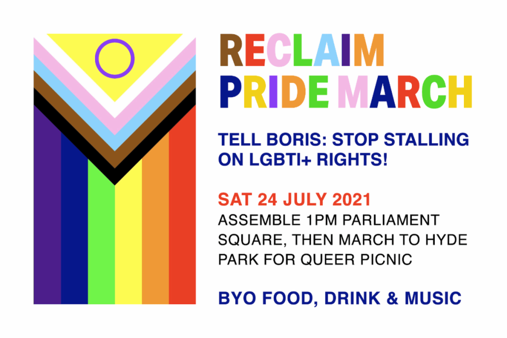 Reclaim Pride puts our human rights back into Pride. Every marcher is urged to make and bring a placard highlighting a LGBTI+ issue that concerns them. We want to make Pride once again an event where our on-going demands for LGBTI+ liberation can be seen and heard.