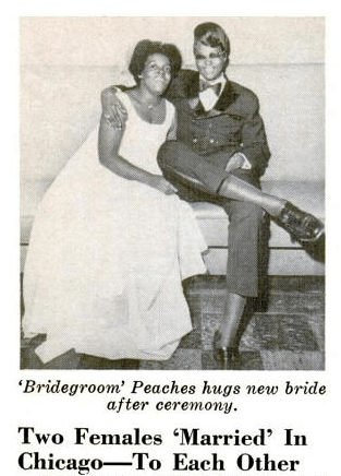 Edna Knowles, on the left, and Peaches Stevens were wed in Liz’s Mark III Lounge, a gay bar on the South Side of Chicago, “before a host of friends and well wishers.” The article ended by noting, “although the duo had a type of ‘marriage license’ in their possession, the state’s official marriage license bureau reported it had no record of their license.” This ending serves to remind Jet readers that Knowles and Stevens’ union was not legitimate in the eyes of the state, as does the use of quotes around the word “married” in the headline.