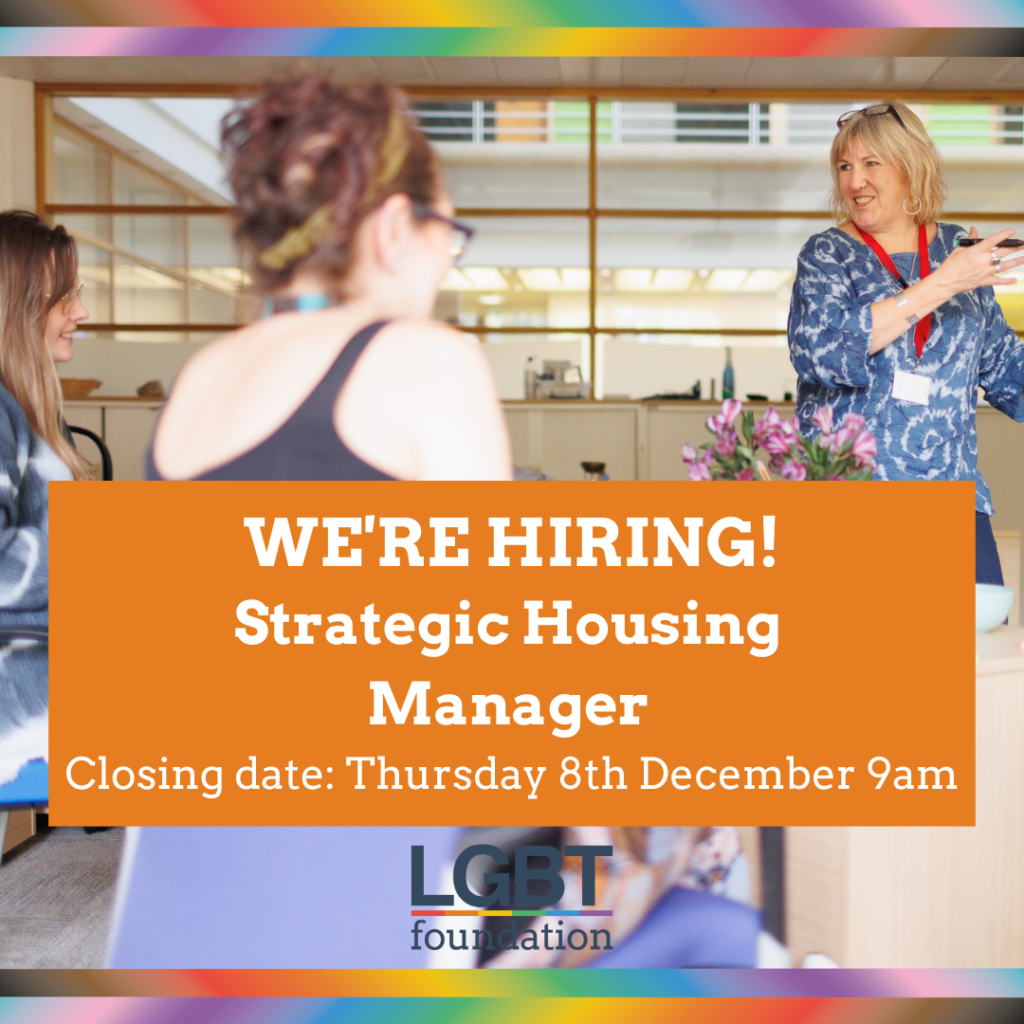 LGBT Foundation is looking for a Strategic Housing Manager to work with the Community Steering Group, the wider LGBTQ+ community, the appointed Housing Provider, a range of stakeholders and Manchester City Council to support the development of the LGBTQ+ Extra Care Scheme in Whalley Range.
