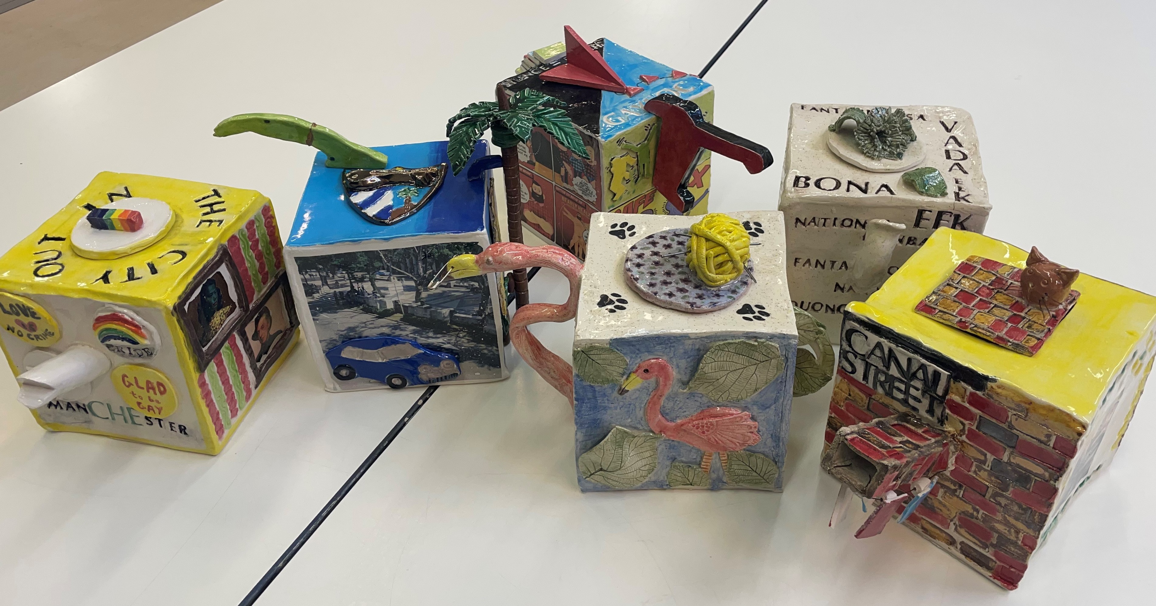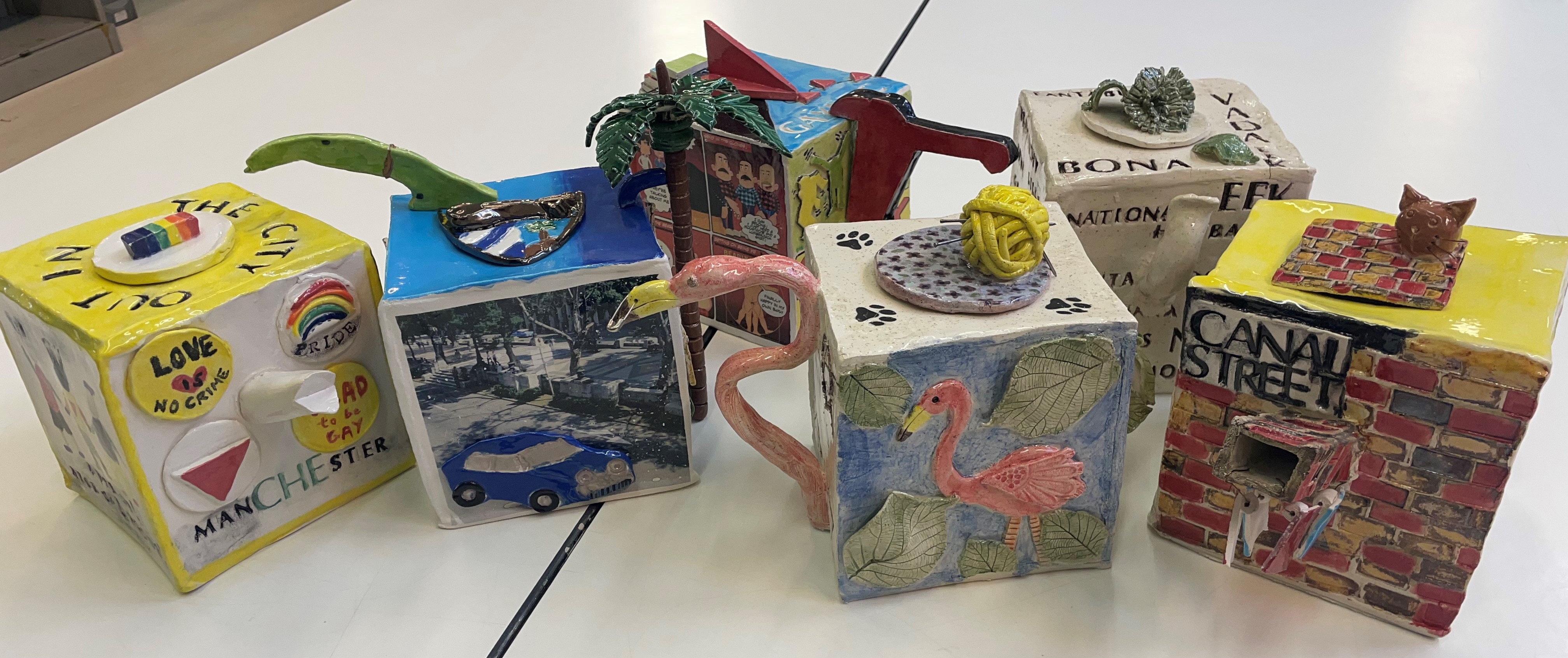 Participants involved in the project used image, shape, colour and texture to design their own individual teapot, inspired by stories, memories and LGBT+ heroes, culture and history from the 1960s, 1970s and 1980s. Each teapot exhibited tells its own unique story. As well as the amazing work the exhibition is also an example of the power of connecting through creativity and sharing our stories and memories with a good helping of sparkle and glitter.