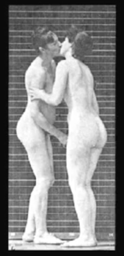 The Kiss was photographed between 1872 and 1885 by Eadweard Muybridge before the invention of the motion picture camera. Animating the photographs has produced the first cinematic kiss.
