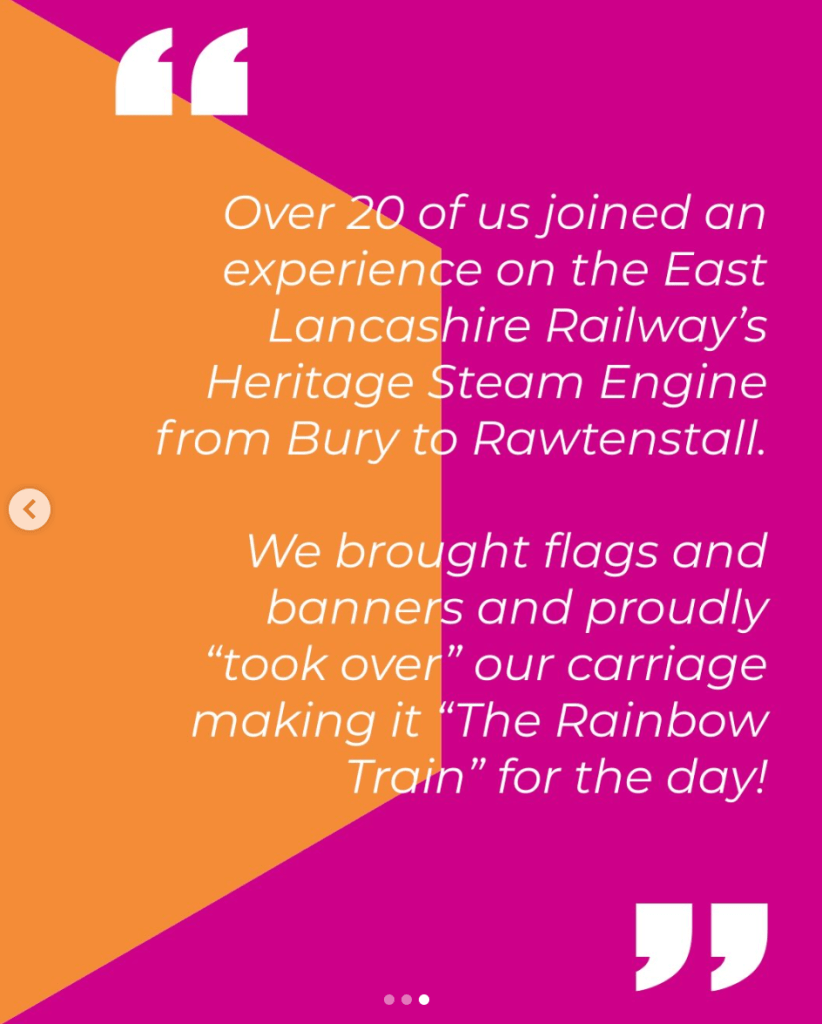 “Using some of our funding from the LGBT+ Futures: Equity Fund, over 20 of us joined an experience on the East Lancashire Railway’s Heritage Steam Engine from Bury to Rawtenstall. We brought flags and banners and proudly ‘took over’ our carriage making it The Rainbow Train for the day!”