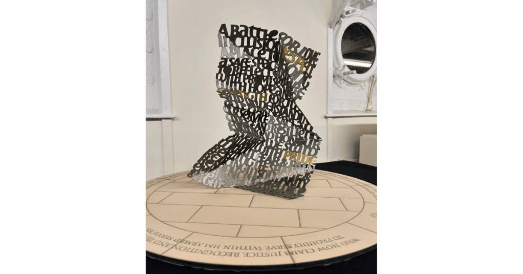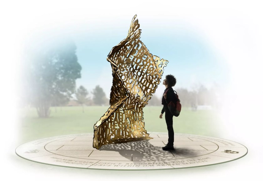 An artist collective from Abrax Academy won the competition by designing a large-scale bronze sculpture in the form of a freestanding letter, its words gathered from collected evidence of those persecuted.