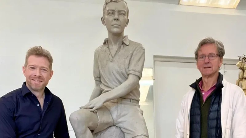 Zeb Soanes, vice chairman of the Britten as a Boy project, with sculptor Ian Rank-Broadley and a clay sculpture of Benjamin Britten as a boy, which has since been cast in bronze