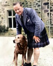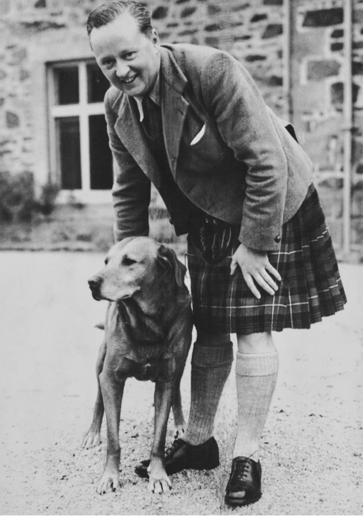 Scottish nobleman, general practitioner and farmer Ewan Forbes-Sempill (1912 – 1991), wearing a traditional Scottish kilt and relaxing with his dog at his residence in Kildrummy, Scotland on 15 October, 1952. FPG / Archive photos / Getty Images