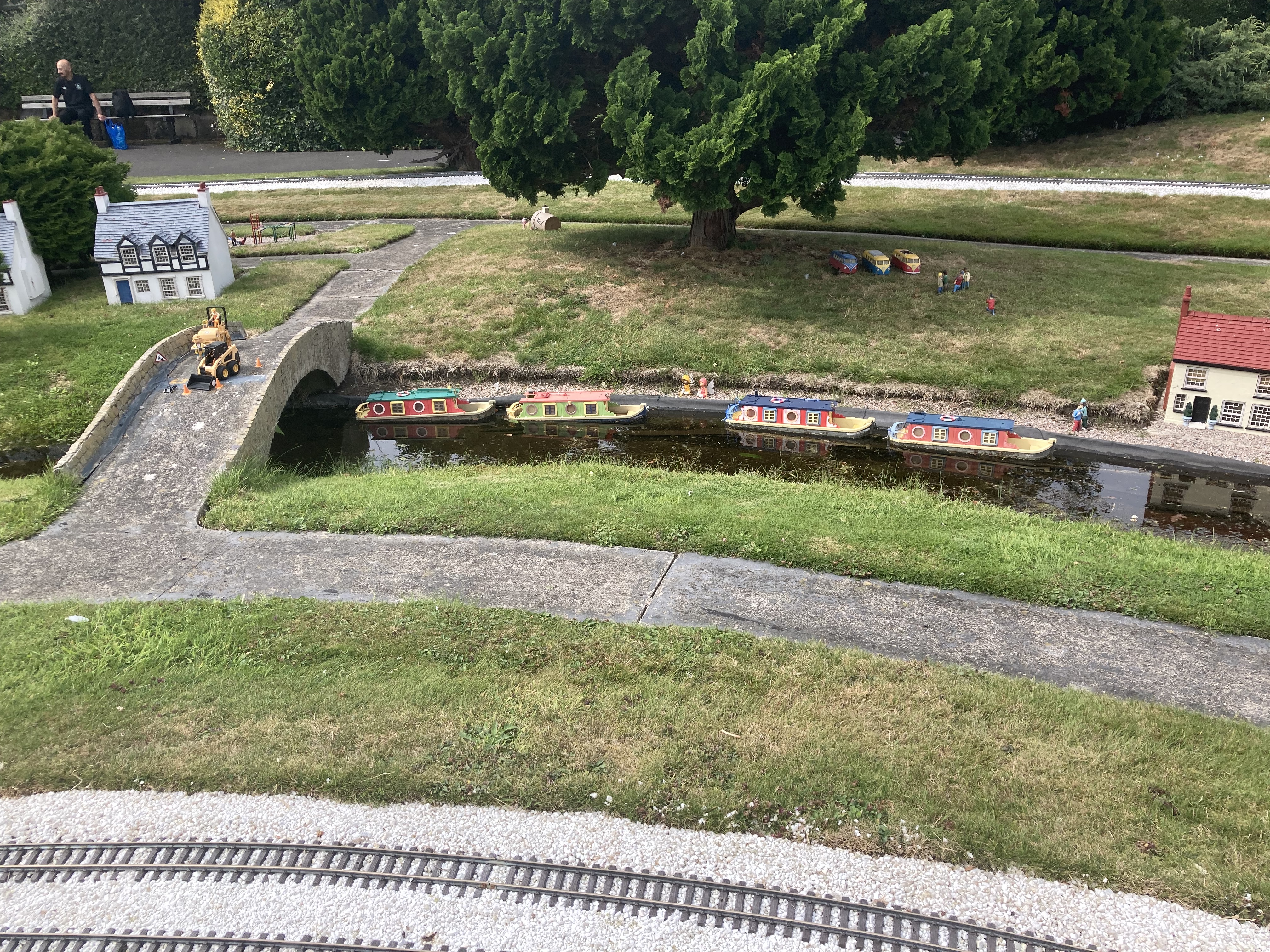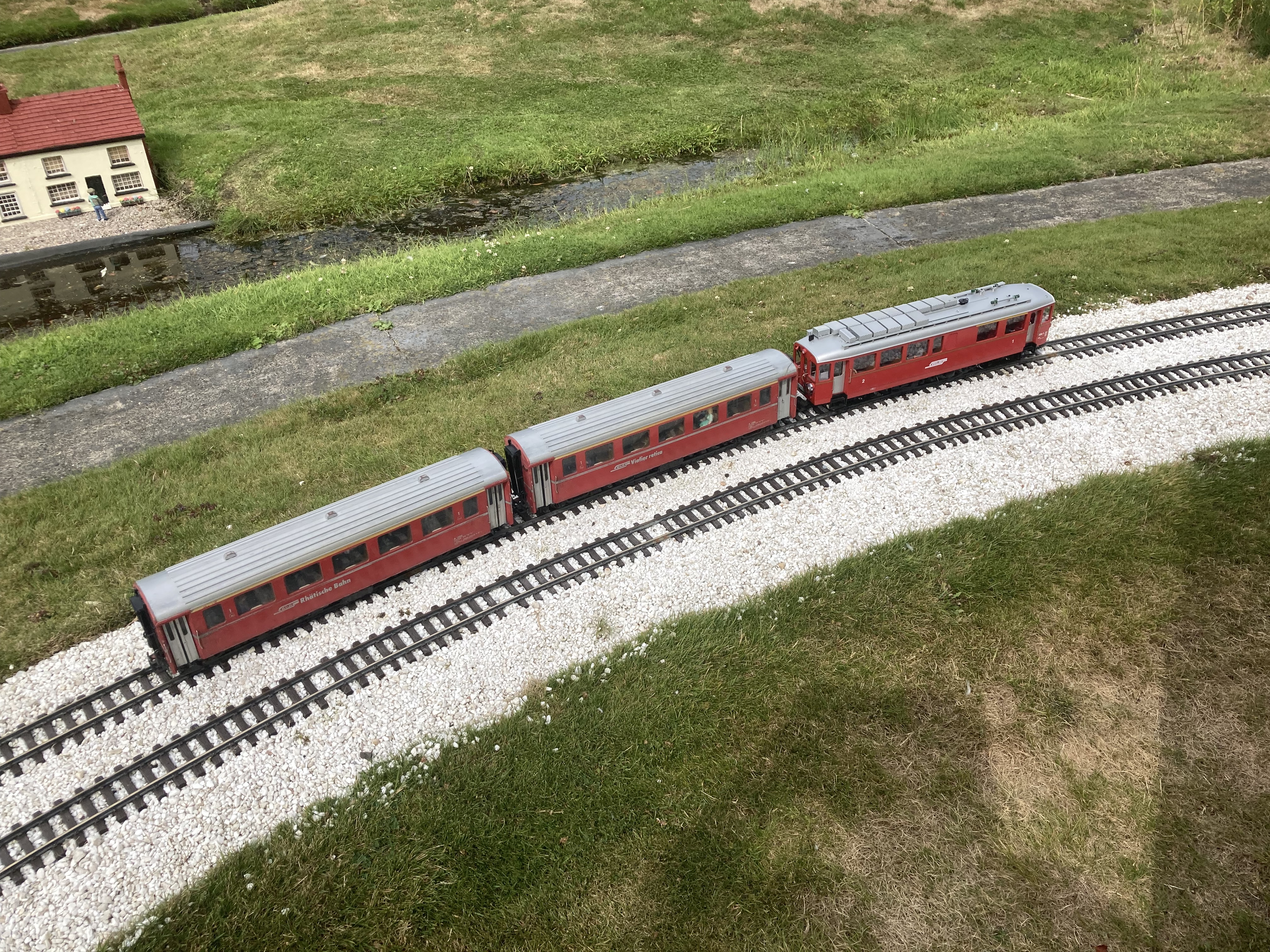 Movement is generated in the model railway village by one of the largest 45 mm garden railway systems in the United Kingdom. It has five LGB trains continuously running on 500 metres of track. By the way, LGB stands for Lehmann Gross Bahn!