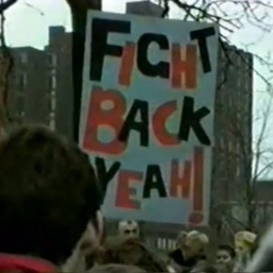 Behind them is a window through which the Imperial War Museum North can be seen.